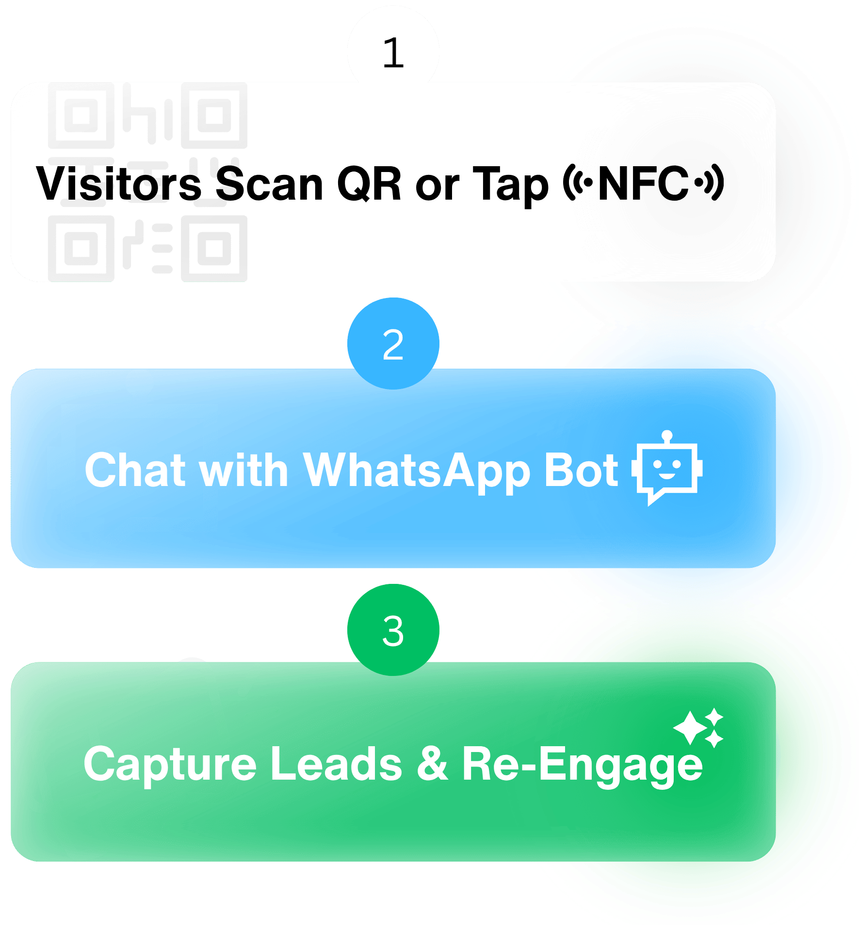 A visitor walks in, scans your QR code — or taps your NFC card — and instantly starts chatting with your WhatsApp agent.